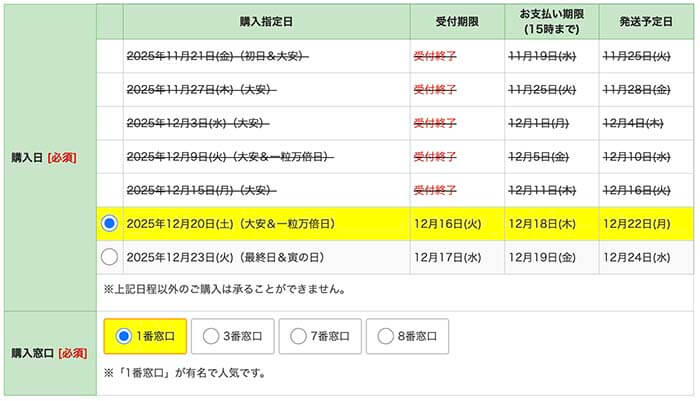 買えるのは縁起の良い日限定ですが、並ばずに確実に買えるので便利。