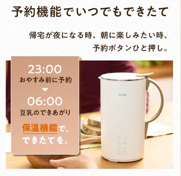 タイマー付がよくて購入しました。初めて豆乳を作った時は出来立ての美味しさにビックリ!!その後は入れる大豆の量を増減してさらり豆乳とぽってり豆乳と作って食べてます。野菜スープも美味しく出来ます。