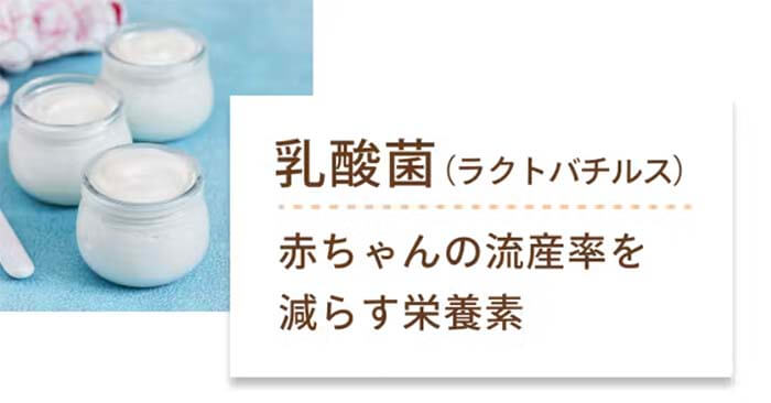 腸や膣などに生息する善玉菌であるラクトバチルスを配合。子宮内フローラを形成し、悪玉菌の増殖を防ぎ、妊娠・出産をサポートする役割が期待できることで注目されています。