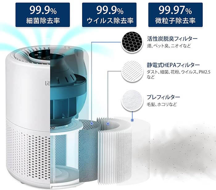 コンパクトなのに清浄力が高く、花粉やホコリの減りを実感できます。就寝時でも気にならず、デザインもシンプルで部屋になじみ、買ってよかったと思える一台です。