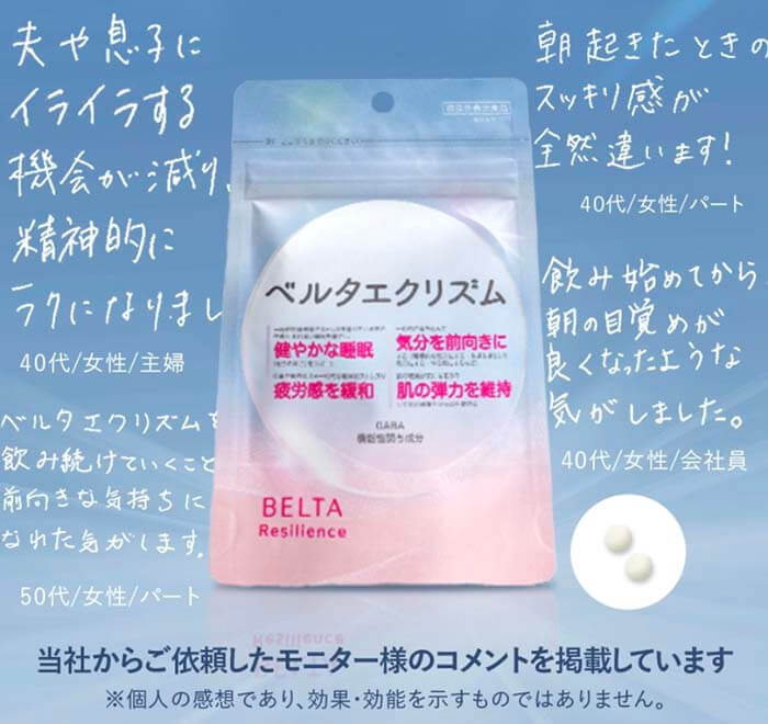 ベルタエクリズム:届出番号:I771 ※本品にはGABAが含まれます。GABAには、一時的な疲労感やストレスを感じている方や中高年者の深い睡眠を増やし、健やかな睡眠(眠りの深さ)を得ることに役立つ機能、仕事や勉強などによる一時的な精神的ストレスや疲労感を緩和する機能、一時的に落ち込んだ気分を前向きにする(積極的な気分にする、生き生きとした気分にする、やる気にするなどの)機能、肌の乾燥が気になる方の肌の弾力を維持し、肌の健康を守るのを助ける機能があることが報告されています。