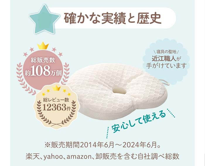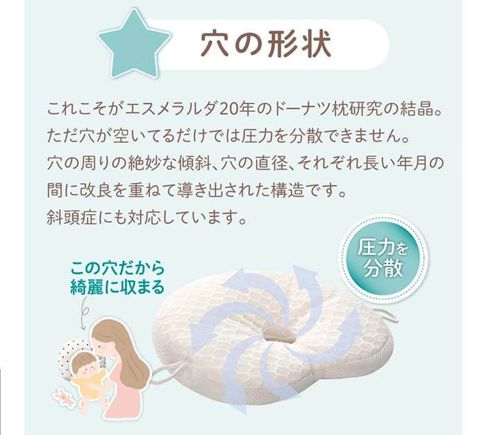 5ヶ月になり後頭部の凹みが気になり購入しました。他の枕では洗濯すると綿が寄ってしまって首元のボリュームがなくなってしまっていました。エスメラルダはその心配がなさそうで期待しています。