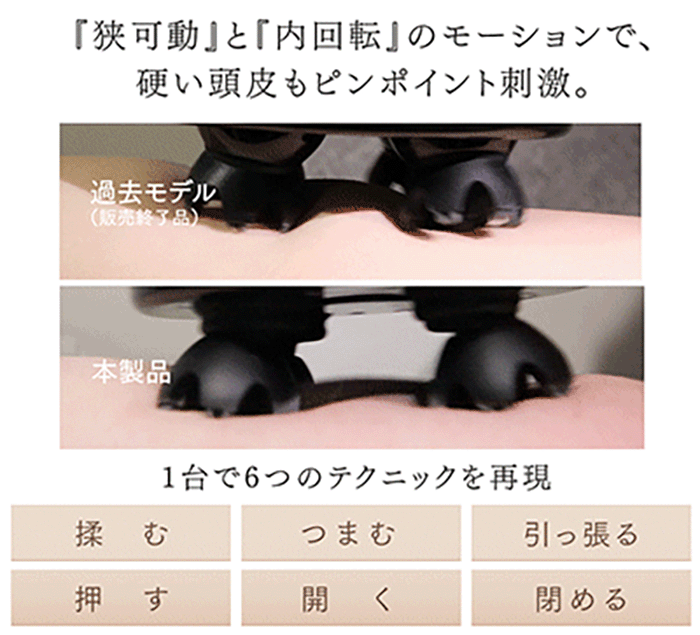 6種類の揉み方でしっかり揉んでくれるます。固まりがちな頭皮もしっかり動かします。