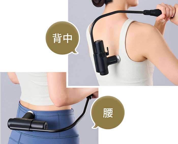 肩甲骨~背中にも使えるようにアームセットを購入。 脱着式のアームとは思えないほど安定しており、しっかりと当てたい箇所に当てて効かせることができ、大変満足です。